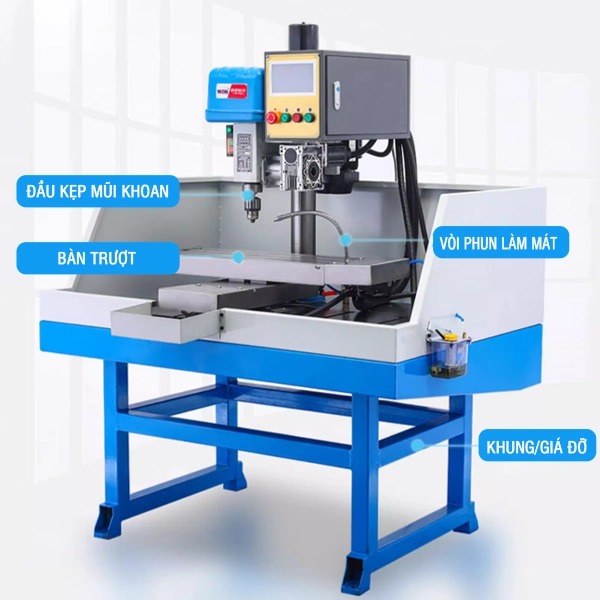 8/ Kết hợp cùng nhiều loại phụ kiện như đầu khoan/taro nhiều mũi, bàn trượt... cho phép khoan/ nhiều lỗ hàng loạt tối ưu gia công