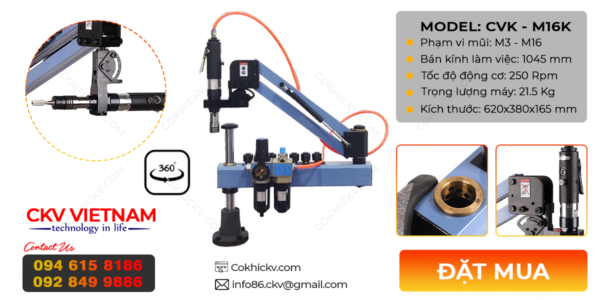 CKV M16K là dòng máy taro tay cần sử dụng khí nén, được thiết kế với cơ cấu tay cần linh hoạt kết hợp đầu taro có khả năng xoay đa hướng. Nhờ đó, người vận hành có thể taro lỗ dễ dàng ở nhiều vị trí khác nhau, kể cả các chi tiết lớn, phôi cồng kềnh hoặc vị trí khó tiếp cận.