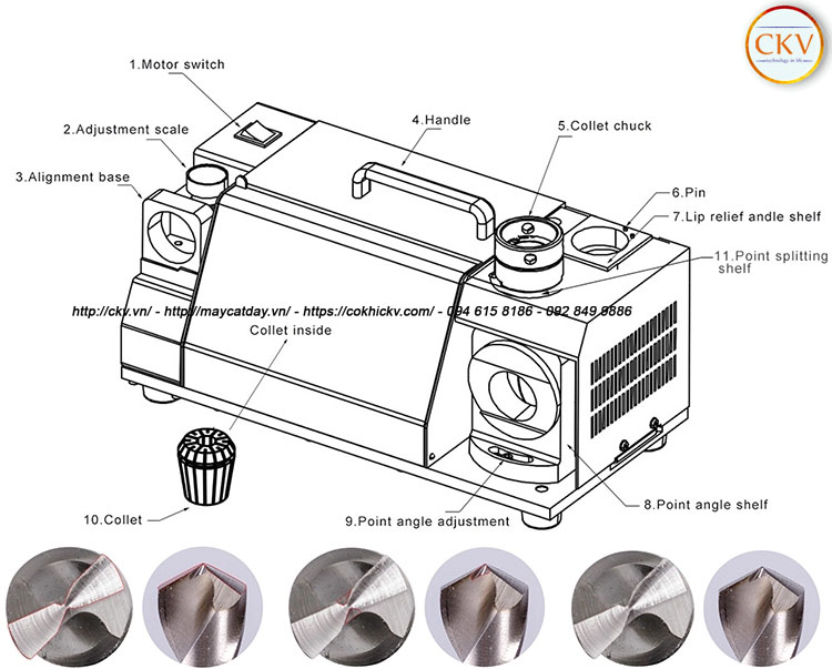 Máy có các cổng mài được đánh số thứ tự chi tiết, giúp quá trình mài mũi khoan thuận tiện, nhanh chóng và chính xác.